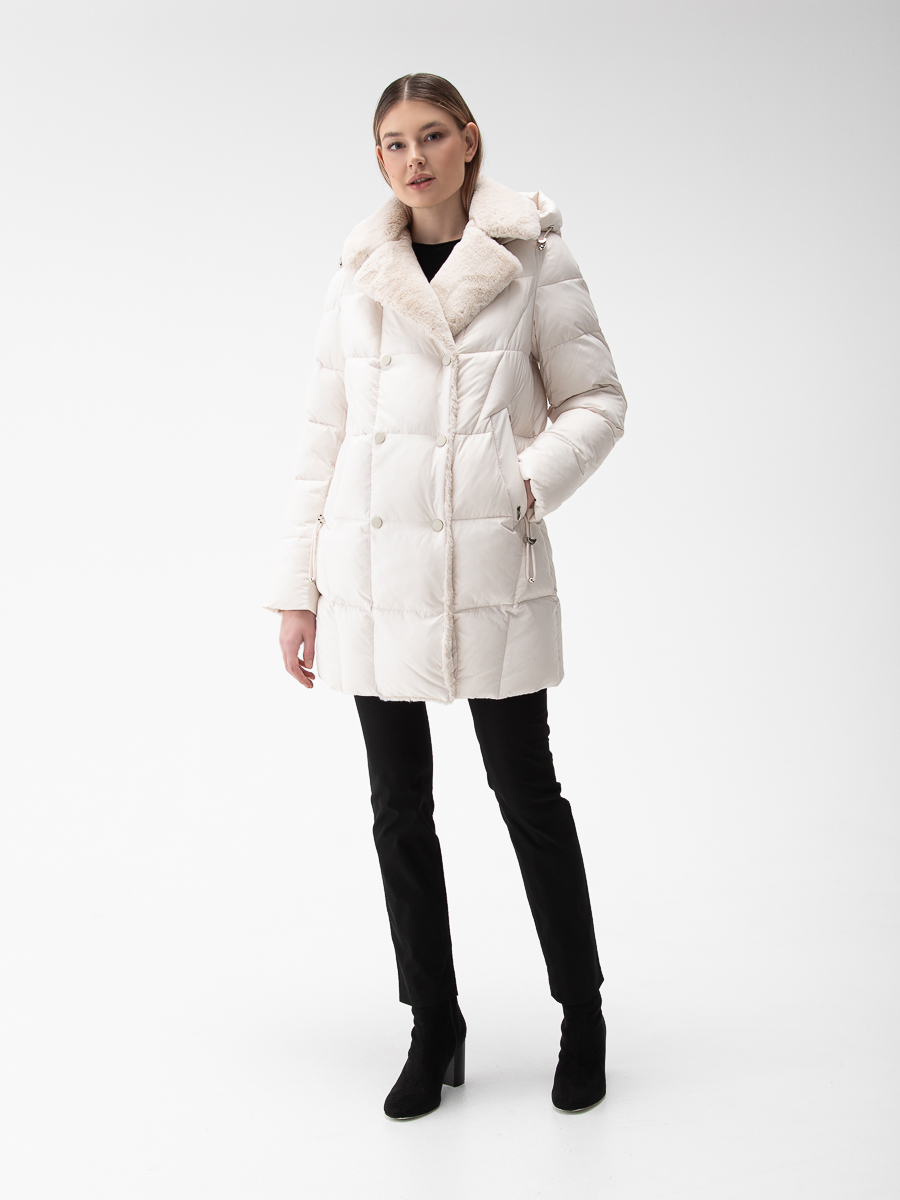 Крой воротника - съёмный капюшон, отделка эко мех